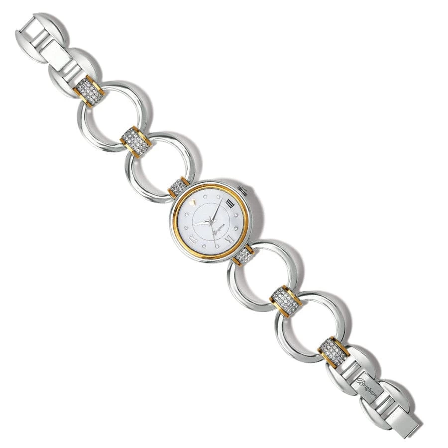 This versatile two-tone watch definitely has the look of a timeless bracelet with links styled after the Meridian Tempo jewelry and a dial decorated with roman numerals and crystals.