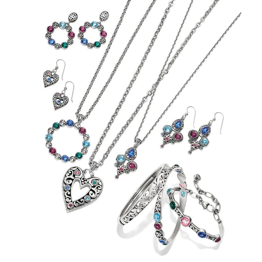 The radiant medley of fine hand-set crystals that wreath this circular pendant necklace is inspired by stained glass windows.