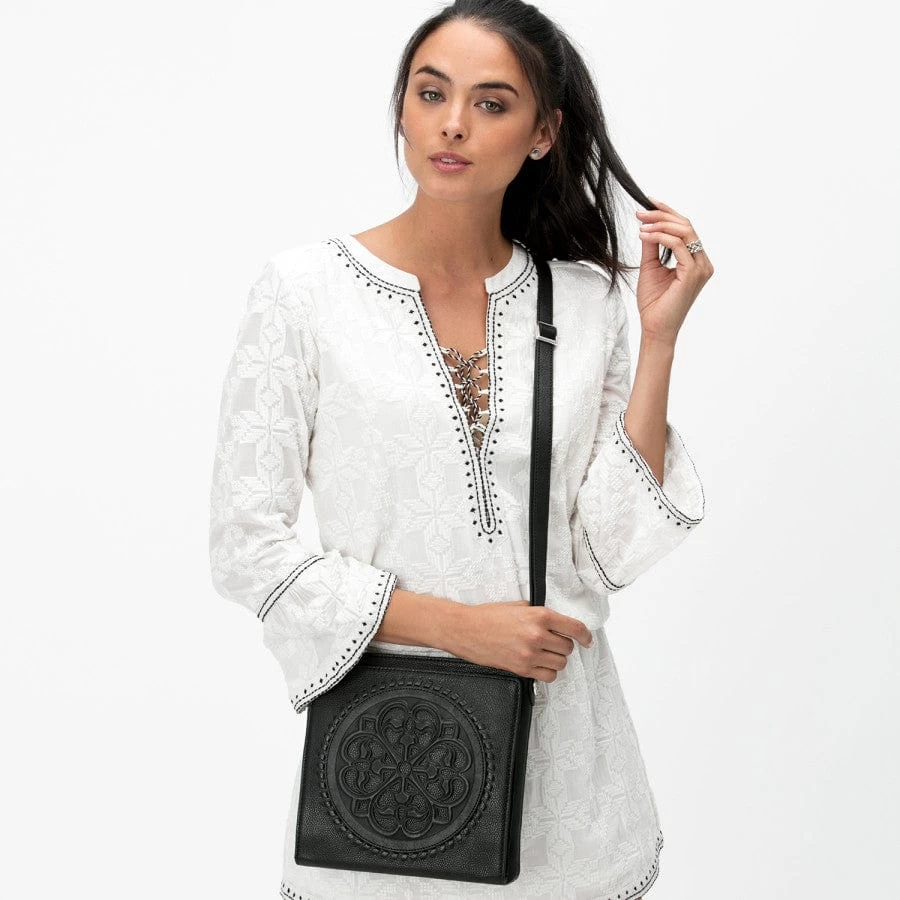 Inspired by the rose windows of Europe’s most breathtaking cathedrals, this crossbody has been embossed, die-cut, stitched and laced, recreating the three-dimensional look of carved white marble. Don’t miss its organizer features!