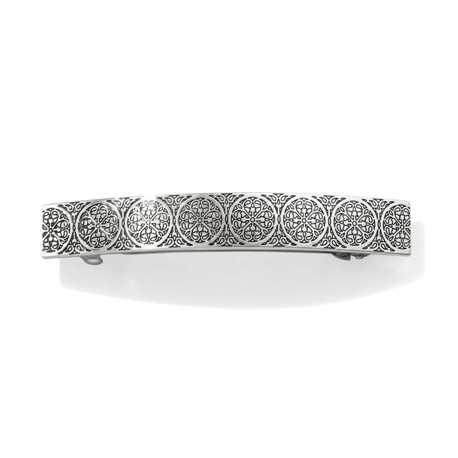 Inspired by the rose window of a European Cathedral, our designer created her own stylized interpretation. It plays out beautifully on this large barrette, adding a timeless elegance to your look.