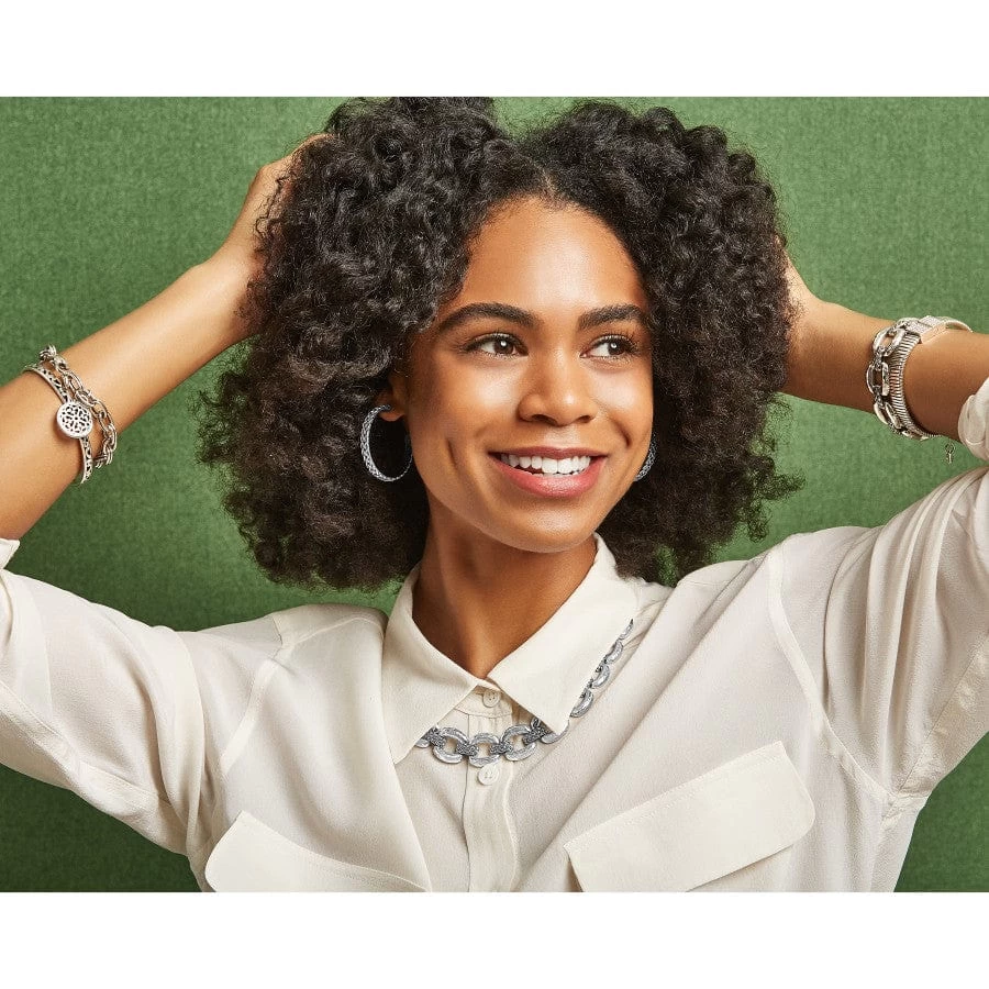 Chain links are back in a big way, and the ones on this bracelet complement its rose-window-inspired ornament. The look is simple and classic – yet stunning. Perfect for stacking with other Brighton silver and two-tone bracelets.