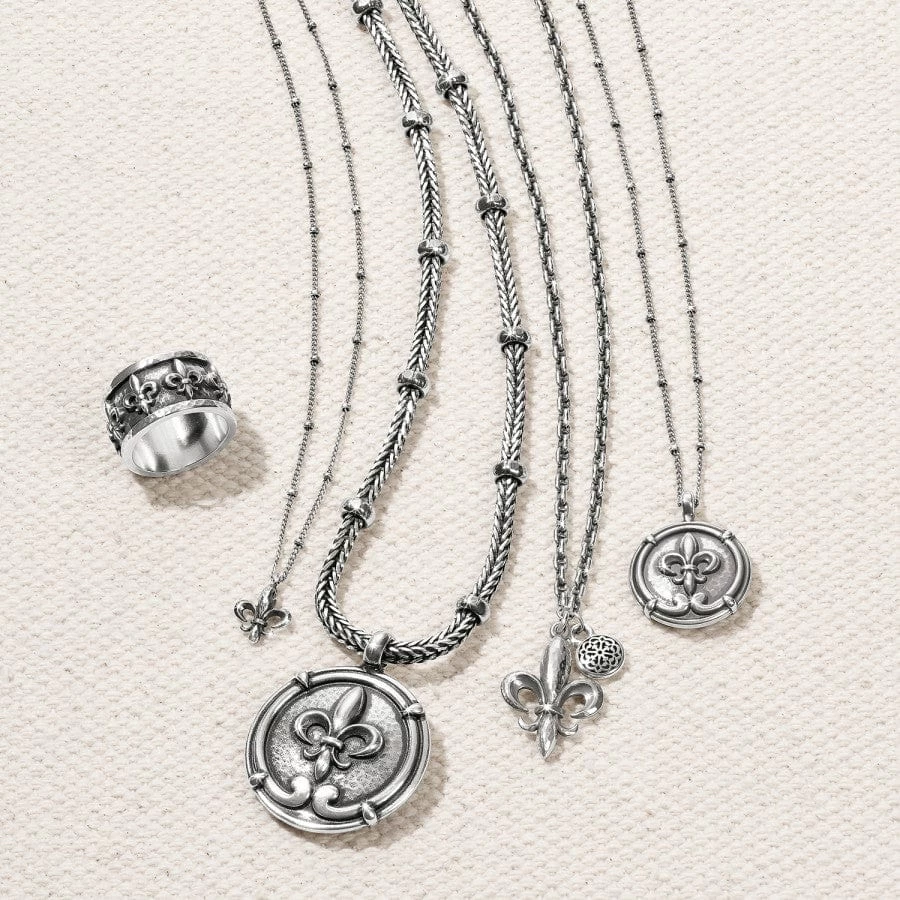 Architectural details of 12th century European cathedrals take a personal, decorative form on this beautiful ring encircled with fleur de lis symbols.