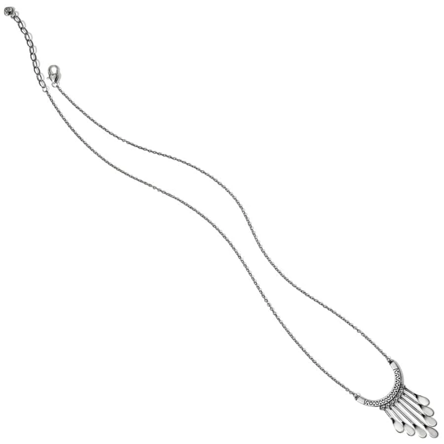 A swingy waterfall of drops is suspended from a u-shaped etched bar for an exotic, on-trend necklace. Marries a Moroccan-influenced design with a hint of Southwest chic.