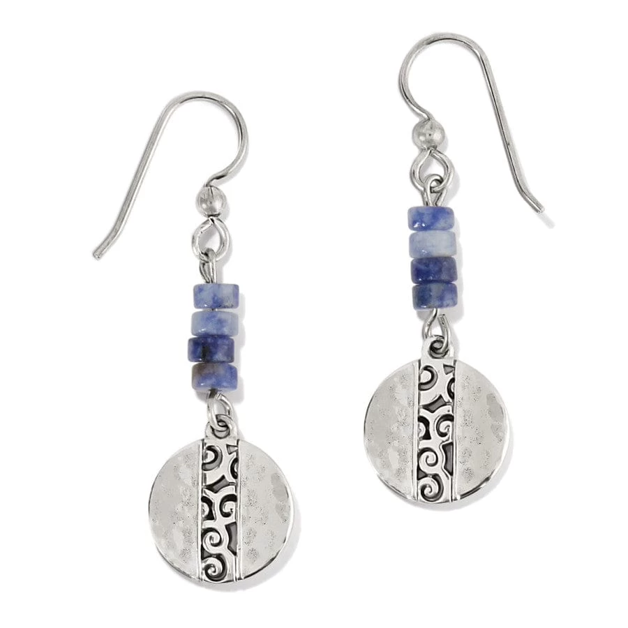 Hammered silver discs with scrolls to match the Mingle Collection dangle from strands of beautiful semi-precious and recycled glass beads – flattering to every face shape and complexion.