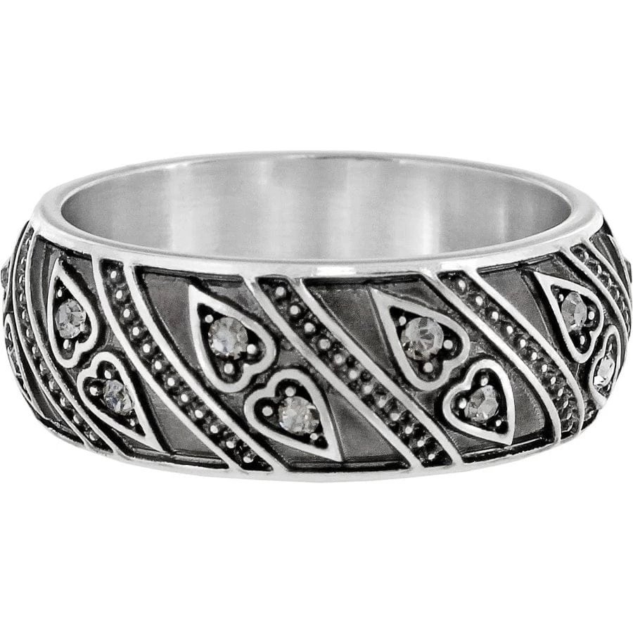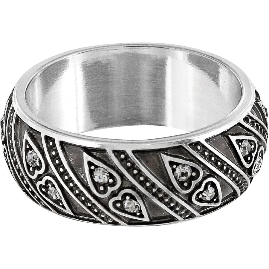 The Mumtaz Heart Ring features a new design that incorporates embellished hearts. Each crystal has been treated to look like the rough cut diamonds typical of antique Indian jewelry.