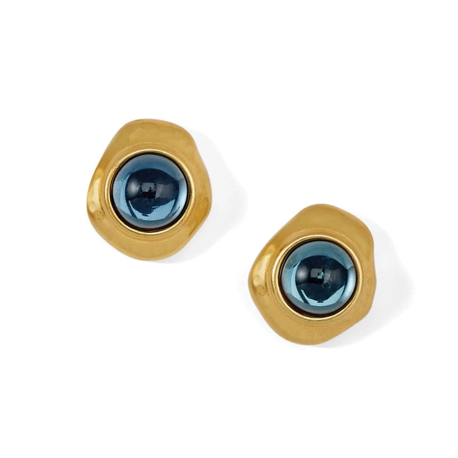 Like Neptune’s fountain, these deep blue earrings are sublime. A brushed gold finish and German glass give the look simplicity and grace. Wear them for special occasions and everyday elegance.