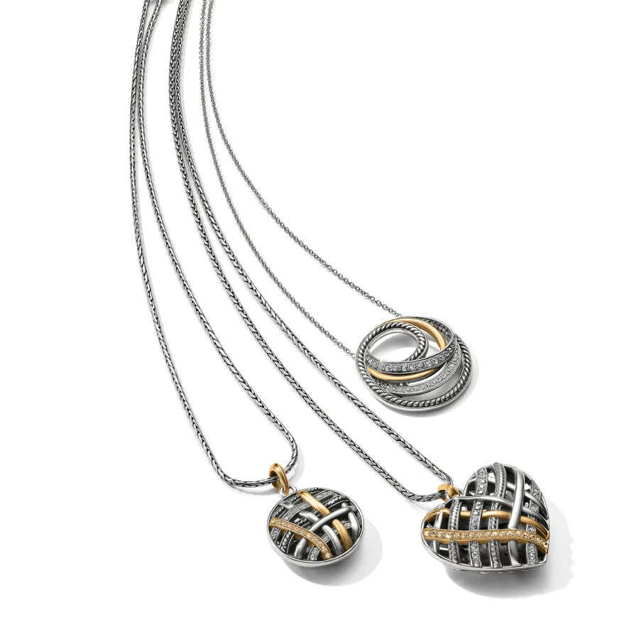 Our captivating heart pendant is a craftsman’s work of art showcasing several fused together “rings” in two-tone metals — a piece to treasure forever.!