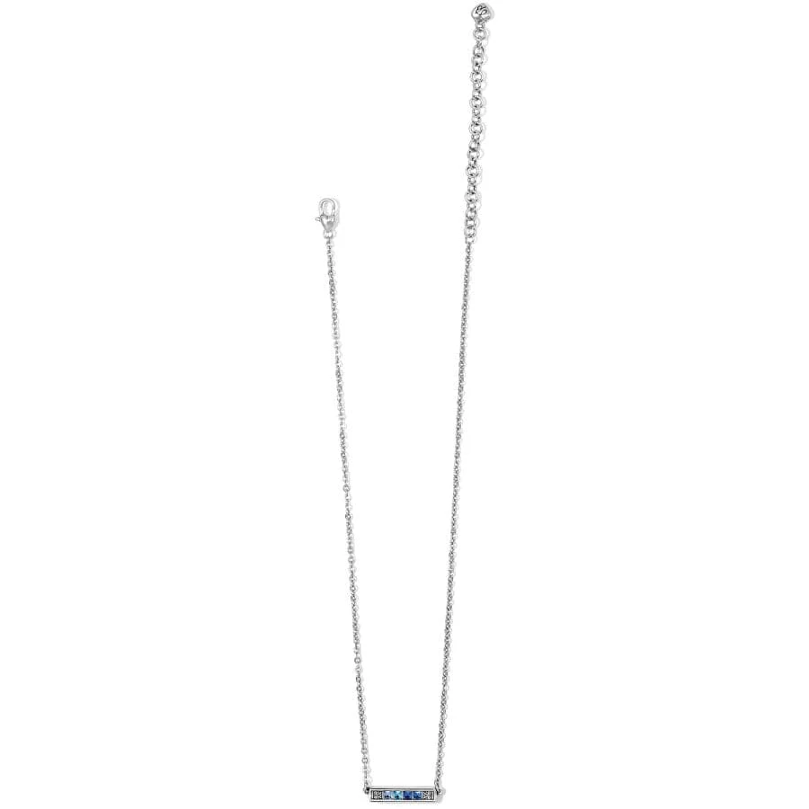 A simple yet elegant bar silhouette adds freshness to this ethereal crystal necklace in cool blue with finely detailed silver scrolls that pay homage to Brighton’s heritage.