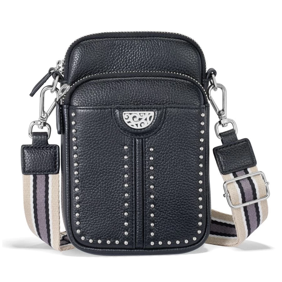 This crossbody is sporty-yet-chic with cool stud ornamentation and a wide webbing strap that has been dyed to match in a rich tri-color. ItÃs small and compact with two zipper pockets to fit your phone and so many more essentials plus a back slit pocket.